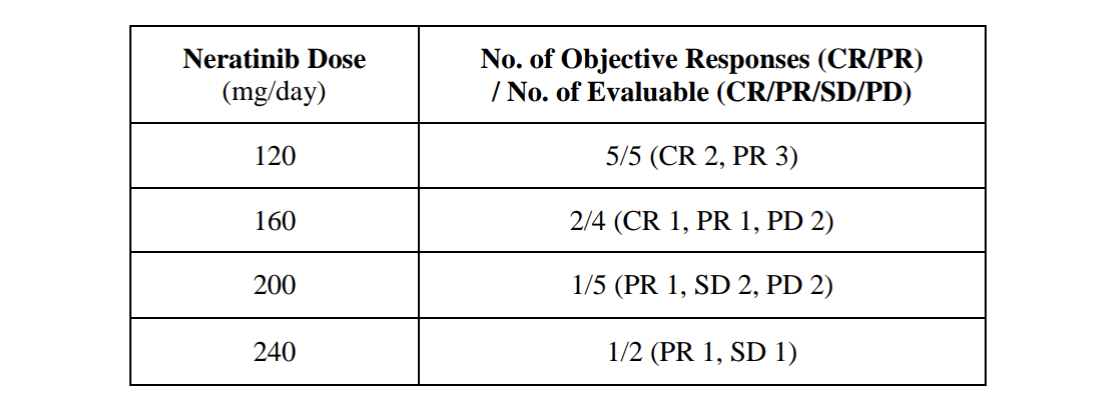 For the 16 patients who were evaluable for efficacy, the objective response (CR/PR) rate was 56%. More specifically, the efficacy results from the trial demonstrated that 3 patients had a complete response (CR) lasting 17.1 months, 11.9 months and 12+ months; 6 patients had a partial response (PR); 3 patients had stable disease (SD); and 4 patients had progressive disease (PD). The number and types of response per dose cohort are summarized in the table below.